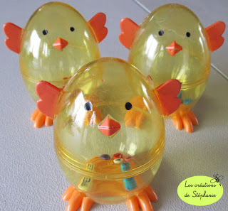 Bon vendredi à vous! J'ai - enfin - reçu ce que j'avais commandé sur Internet, des perles colorées avec les lettres de l'alphabet. Petite déception, elles sont plus petites que je pensais... Je devrais peut-être apprendre les anciennes mesures pour ne plus me faire prendre. Cependant, je vous partage quand même mes idées d'ateliers. J'ai utilisé des oeufs et poussins translucides que j'ai acheté au Dollorama et aux Escomptes Lecompte en paquet de trois et les perles que j'ai commandées sur Ebay en paquet de 200 pour moins de deux dollars.